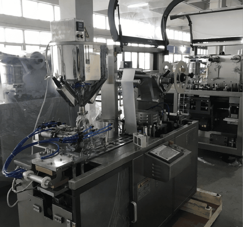 - Plastic roll——Heating——Forming —— Automatic cooling —— Automatic paste feeding —— PE/ALU foil/paper card sealing —— Printing batch —— Cutting —— Products output