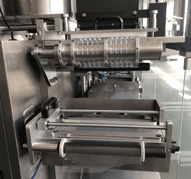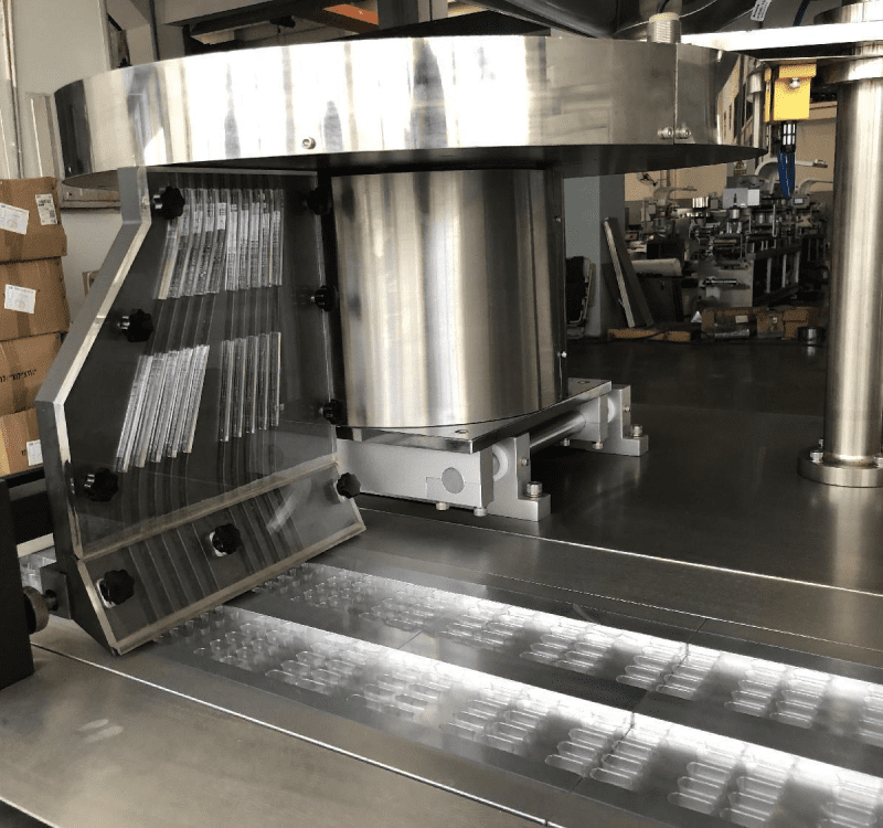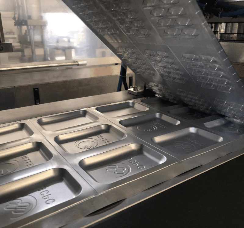Work progress: plastic sheet heating→film forming→filling product→heat sealing→cutting